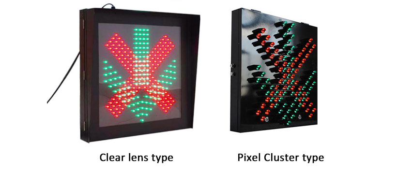 Los indicadores de carril con flecha verde y cruz roja actuales vienen en dos tipos: con lente transparente y con agrupación de píxeles. GA Traffic suministra ambos tipos.