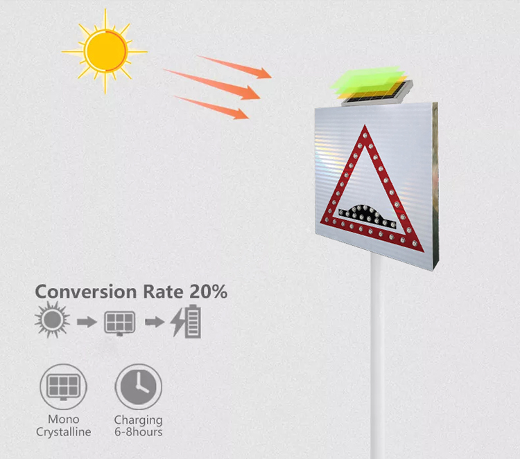 La señal de tráfico LED solar de GA está cubierta con material reflectante de alto rendimiento que mejora la visibilidad y tiene la capacidad de parpadear día y noche con ciertos períodos.
