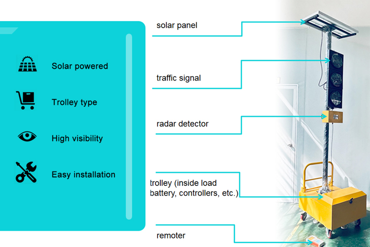 Estos semáforos móviles que funcionan con baterías se utilizan cuando se realizan obras en la carretera. Son portátiles y fáciles de configurar. Con la última tecnología, completamente silencioso e inalámbrico.